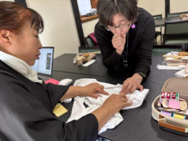 えみぃさんに、嘘つき襦袢の半襟付けを教えてもらいました。