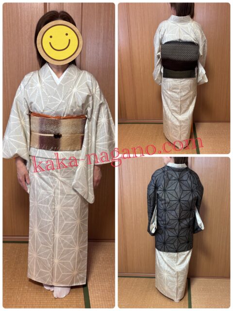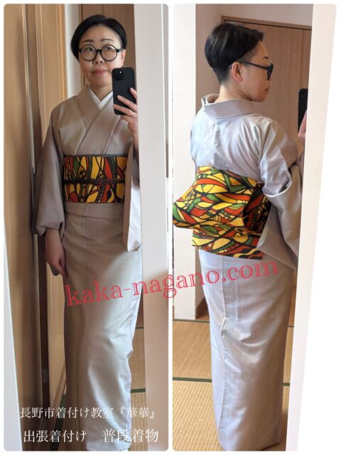 小紋のお着物に、洒落袋帯で二重太鼓の練習です!!