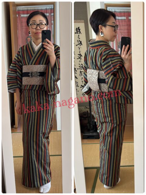 単衣に半幅でカルタ結びゴムベルトを帯締めかわりに。