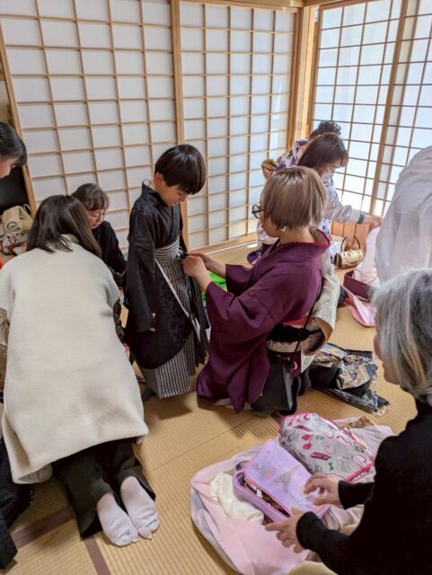 お義母さんに着物を着せて、娘夫婦は羽織り姿、孫は被布を喜んで着てくれて付いていた飾りを引っ張って外してくれましたー。